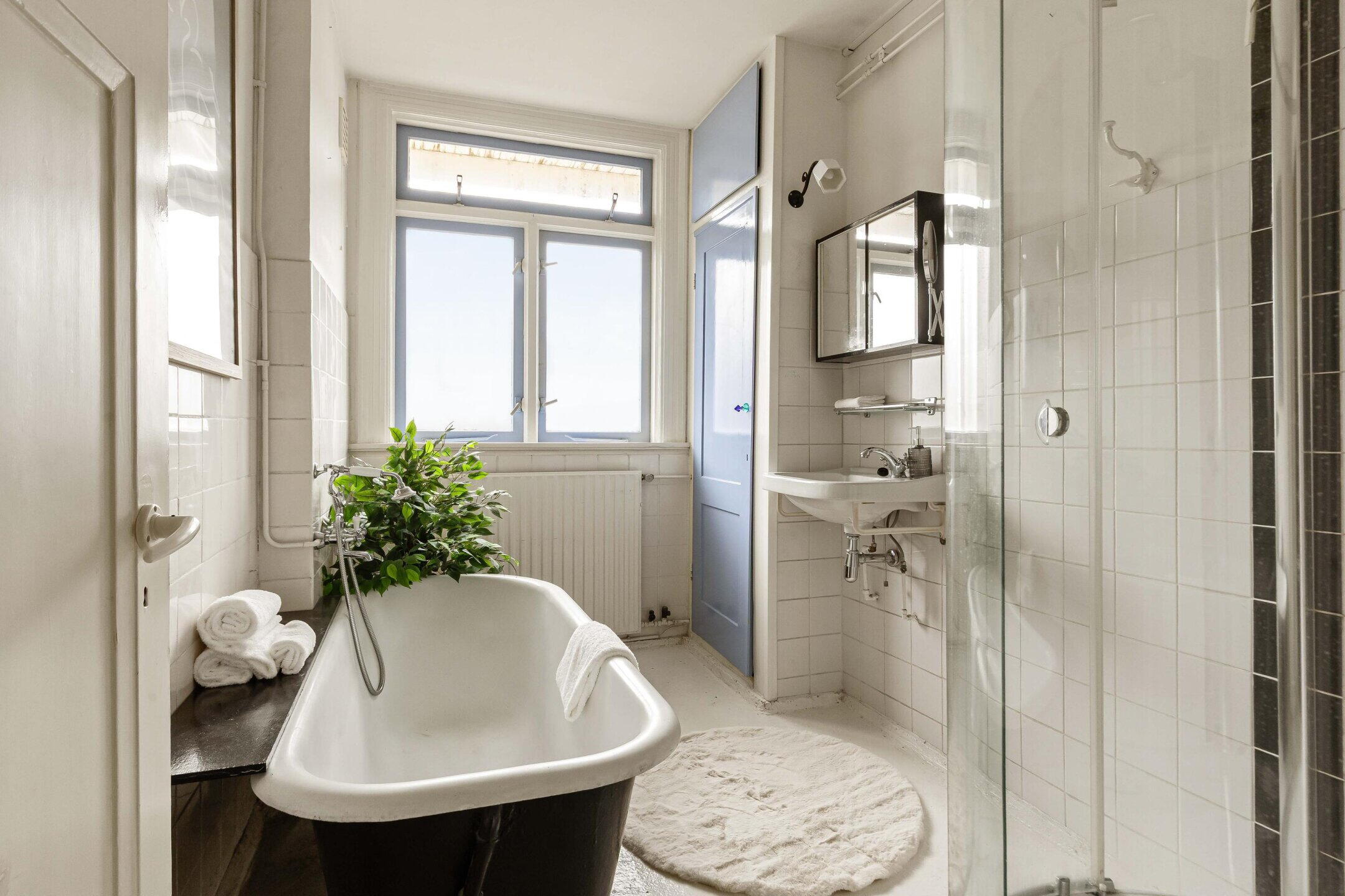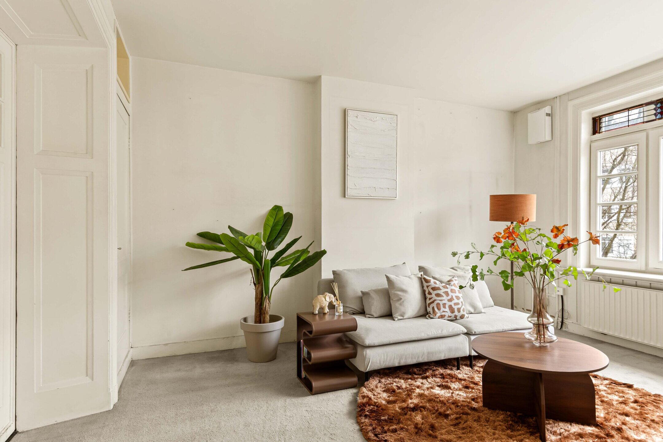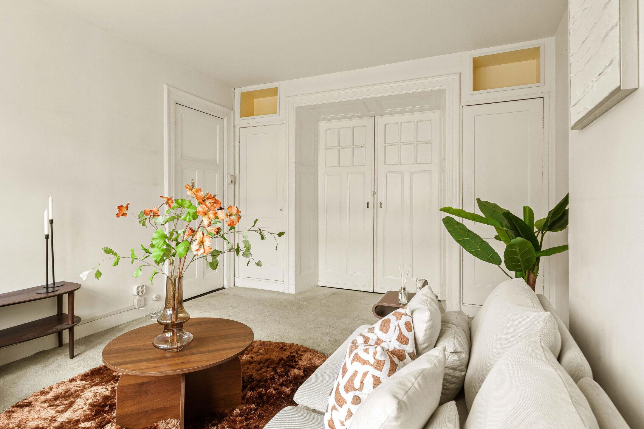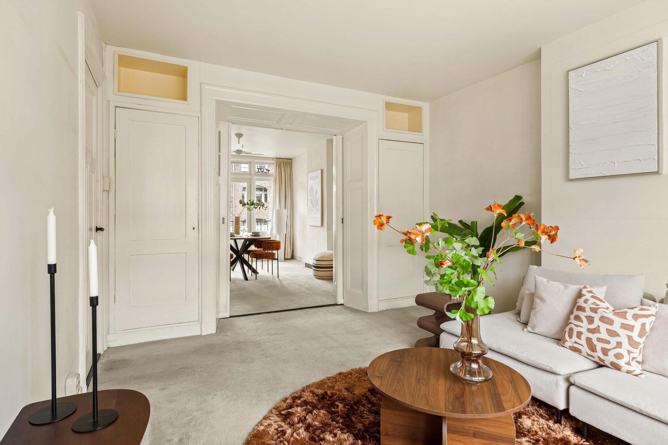 Aan de voorzijde bevindt zich de ruime woonkamer met grote raampartijen en fraai glas-in-lood in de bovenlichten. Dankzij de brede opzet en het vrije zicht over de straat is dit een bijzonder lichte en prettige leefruimte. De en suite-indeling met schuifdeuren verbindt de woonkamer met de eetkamer aan de achterzijde. Deze klassieke indeling geeft het appartement karakter en biedt de mogelijkheid om de ruimtes open met elkaar te verbinden of juist separaat te gebruiken.