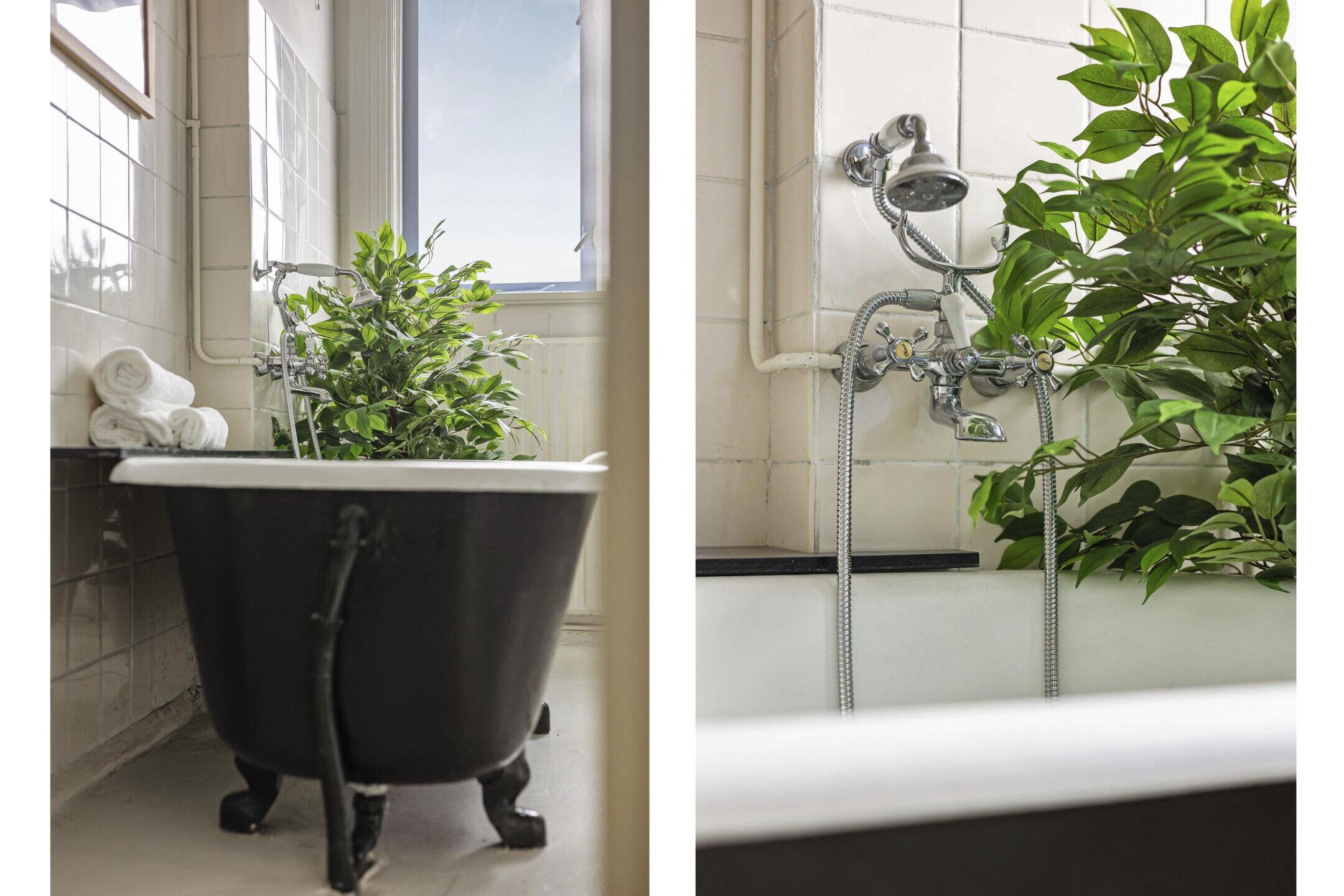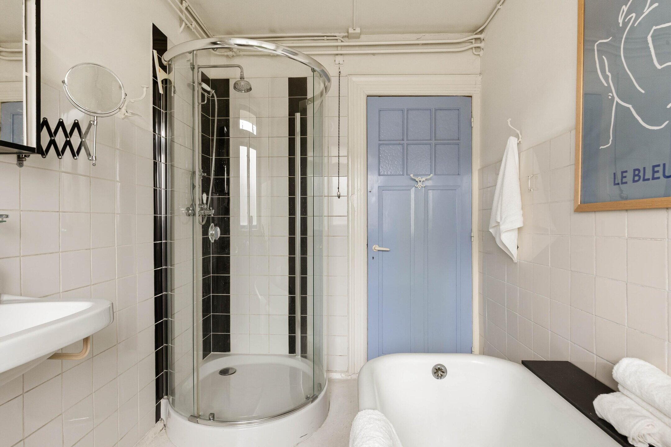 De badkamer is uitgerust met een comfortabel ligbad, separate douche, wastafel en toilet. Daarnaast is er een apart gastentoilet bereikbaar vanuit de hal.