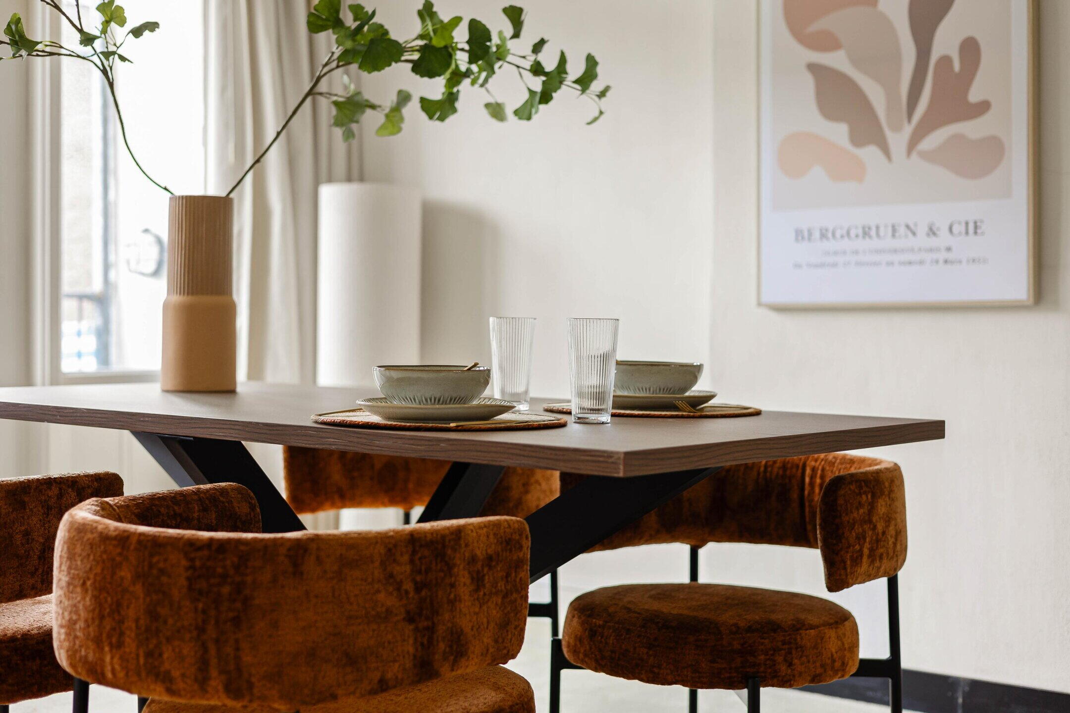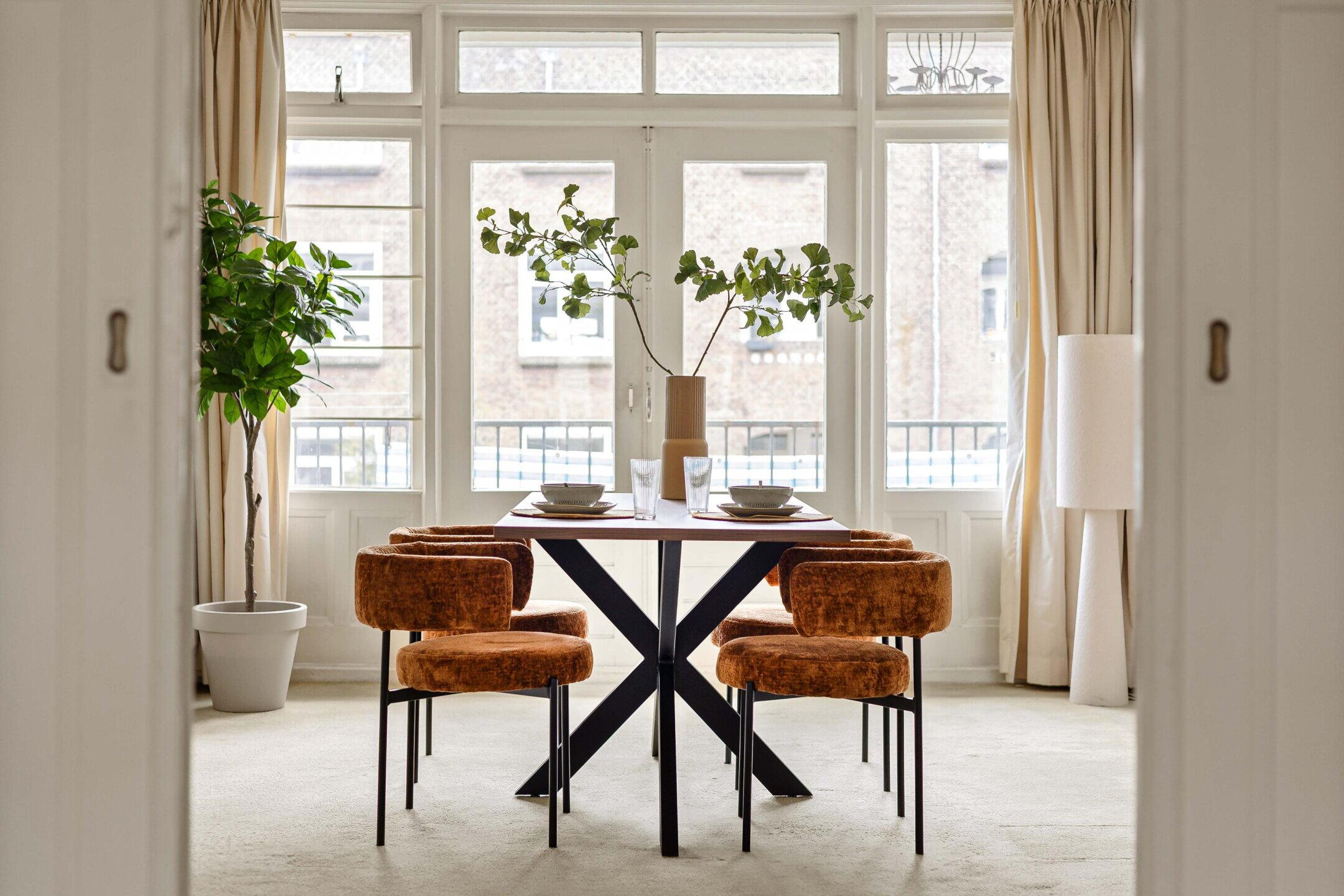 De eetkamer aan de achterzijde kijkt uit op de binnentuinen en biedt toegang tot het brede balkon dat zich uitstrekt over vrijwel de gehele breedte van de woning. Hier geniet je van rust en groen midden in de stad.